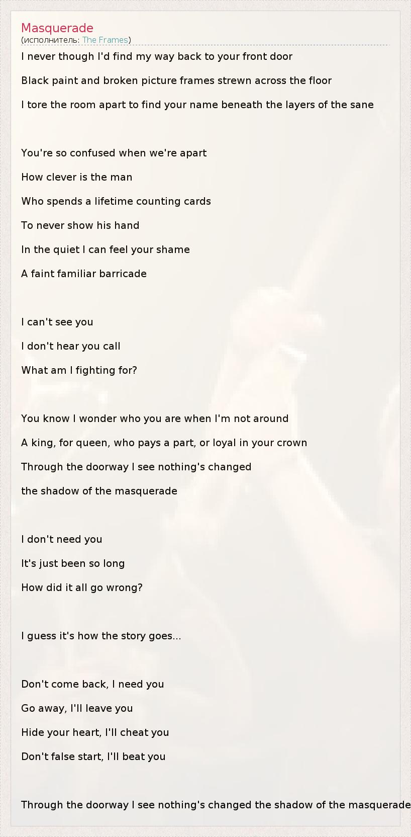 Through the doorway I see nothing's changed the shadow of the masquerade