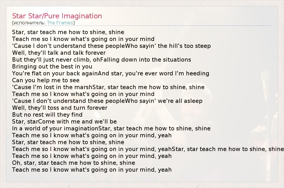 Star, star teach me how to shine, shine Teach me so I know what's going on in your mind 'Cause I don't understand these peopleWho sayin' the hill's too steep Well, they'll talk and talk forever But they'll just never climb, ohFalling down into the situations Bringing out the best in you You're flat on your back againAnd star, you're ever word I'm heeding Can you help me to see 'Cause I'm lost in the marshStar, star teach me how to shine, shine Teach me so I know what's going on in your mind 'Cause I don't understand these peopleWho sayin' we're all asleep Well, they'll toss and turn forever But no rest will they find Star, starCome with me and we'll be In a world of your imaginationStar, star teach me how to shine, shine Teach me so I know what's going on in your mind, yeah Star, star teach me how to shine, shine Teach me so I know what's going on in your mind, yeahStar, star teach me how to shine, shine Teach me so I know what's going on in your mind, yeah Oh, star, star teach me how to shine, shine Teach me so I know what's going on in your mind, yeah