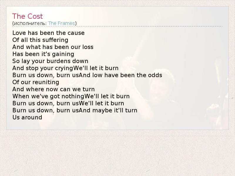 Love has been the cause Of all this suffering And what has been our loss Has been it's gaining So lay your burdens down And stop your cryingWe'll let it burn Burn us down, burn usAnd low have been the odds Of our reuniting And where now can we turn When we've got nothingWe'll let it burn Burn us down, burn usWe'll let it burn Burn us down, burn usAnd maybe it'll turn Us around