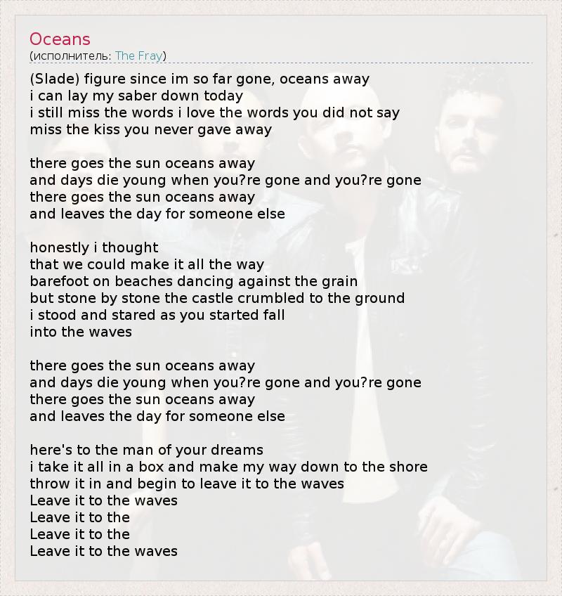 Это интересно:The Fray – американская группа, играющая альтернативный рок. Она была сформирована в 2002 году в Денвере, штат Колорадо, США. Основатели группы, Джо Кинг и Айзек Слэйд, знали друг друга еще со школьных лет. То, что они стали играть, очень понравилось знакомым Слэйда по его предыдущей группе, Бена Высоцки и Дэйва Уэлша. После того как эти двое присоединились к проекту, формирование группы завершилось.... продолжение