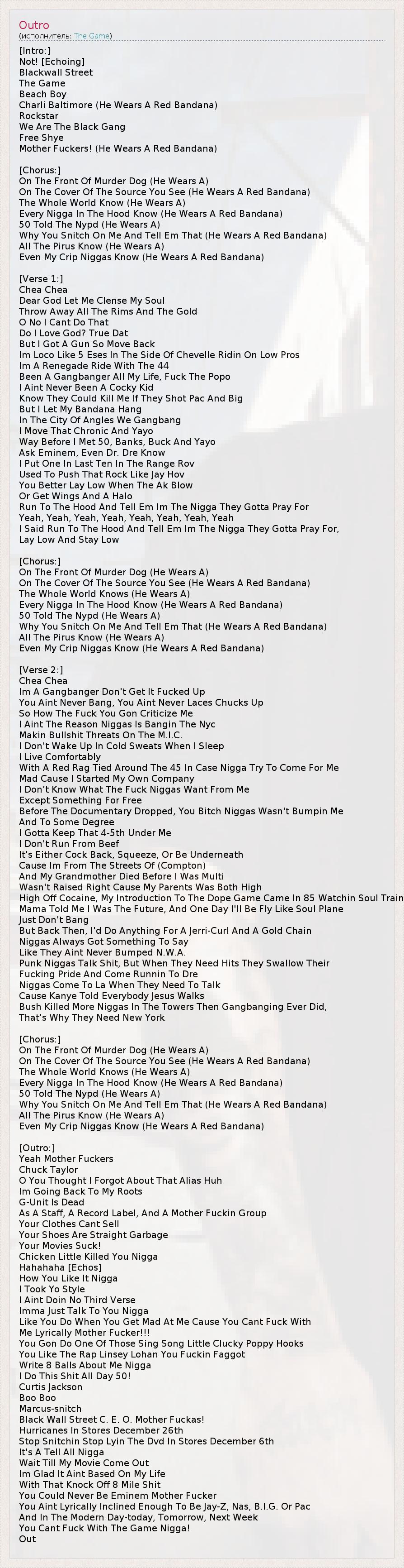 Это интересно:Джейсон Тейлор (AKA The Game) родился 27 ноября 1979 года прославленном пригороде Лос-Анджелеса, Комптоне. Прозвище Game («игра») музыканту дала бабушка, мотивируя это тем, что внук постоянно в игре – от баскетбола и велосипеда до музыки «игр» между уличными бандами. Семейные проблемы, связанные с изнасилованием сестры рэппера его отцом, заставили провести его в детском доме с 3 по 9 класс. «Мое детство... продолжение