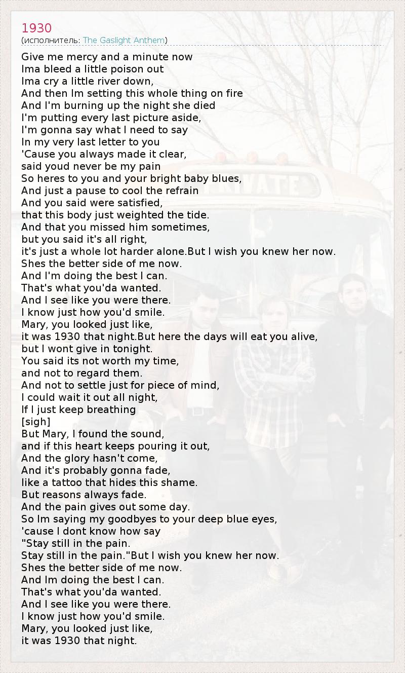 Это интересно:The Gaslight Anthem - это панк-группа из города Нью-Брунсвик, штат Нью-Джерси. С момента образования группы в 2005 году, они успели выпустить четыре альбома и два EP. Журнал Kerrang! описал The Gaslight Anthem как "лучшую группу которую вы услышите в 2008 году". TGA добились своего уникального звучания, смешав воедино элементы блюза, классического рока и панк рока.Состав группы: Brian Fallon (вокал, гитара), Alex Levine... продолжение