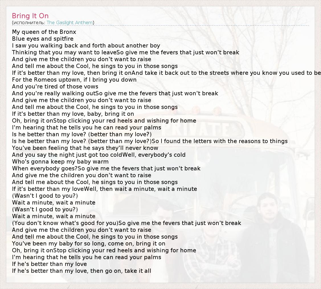 Это интересно:The Gaslight Anthem - это панк-группа из города Нью-Брунсвик, штат Нью-Джерси. С момента образования группы в 2005 году, они успели выпустить четыре альбома и два EP. Журнал Kerrang! описал The Gaslight Anthem как "лучшую группу которую вы услышите в 2008 году". TGA добились своего уникального звучания, смешав воедино элементы блюза, классического рока и панк рока.Состав группы: Brian Fallon (вокал, гитара), Alex Levine... продолжение