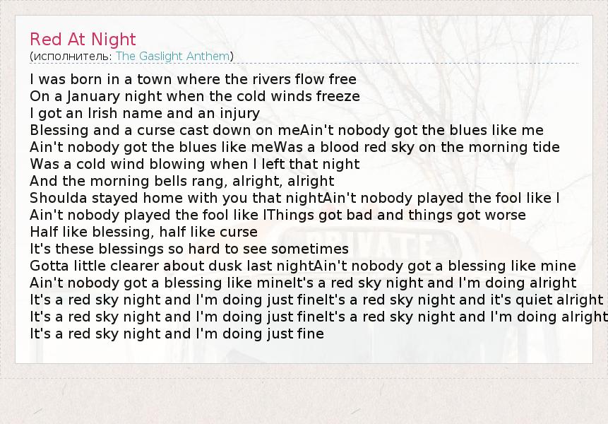 It's a red sky night and I'm doing just fineIt's a red sky night and it's quiet alright
