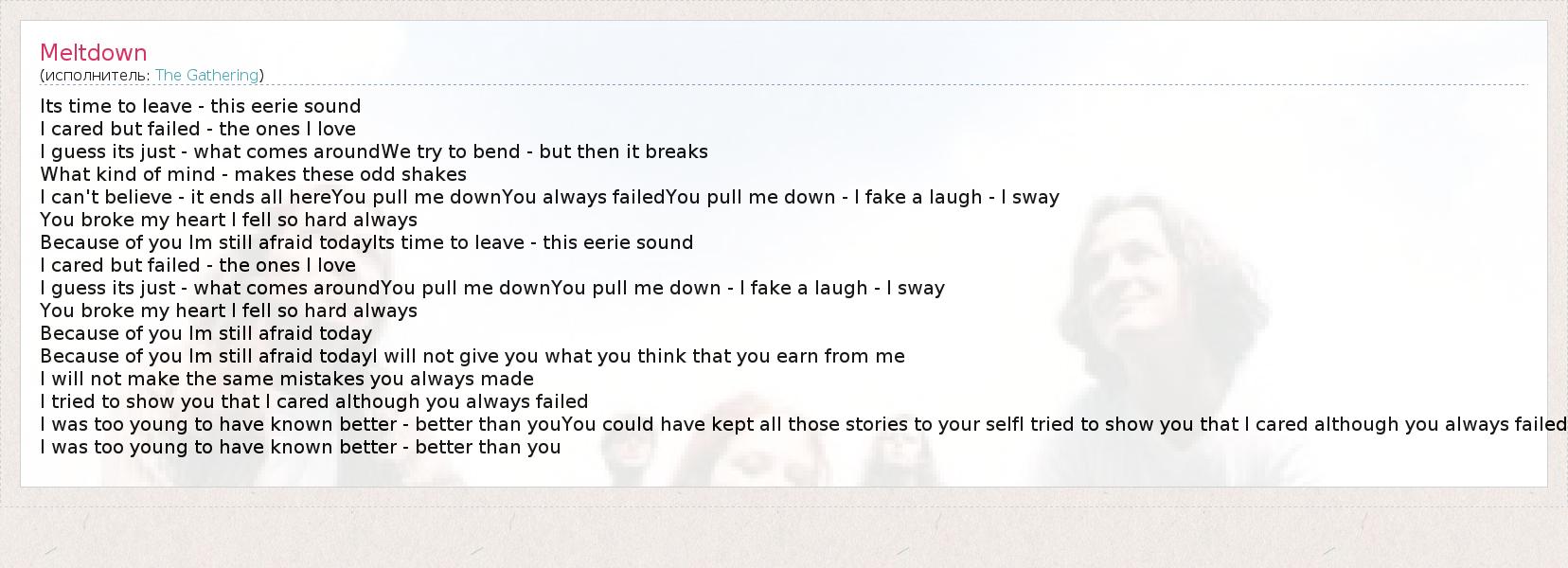 Its time to leave - this eerie sound I cared but failed - the ones I love I guess its just - what comes aroundWe try to bend - but then it breaks What kind of mind - makes these odd shakes I can't believe - it ends all hereYou pull me downYou always failedYou pull me down - I fake a laugh - I sway You broke my heart I fell so hard always Because of you Im still afraid todayIts time to leave - this eerie sound I cared but failed - the ones I love I guess its just - what comes aroundYou pull me downYou pull me down - I fake a laugh - I sway You broke my heart I fell so hard always Because of you Im still afraid today Because of you Im still afraid todayI will not give you what you think that you earn from me I will not make the same mistakes you always made I tried to show you that I cared although you always failed I was too young to have known better - better than youYou could have kept all those stories to your selfI tried to show you that I cared although you always failed I was too young to have known better - better than you