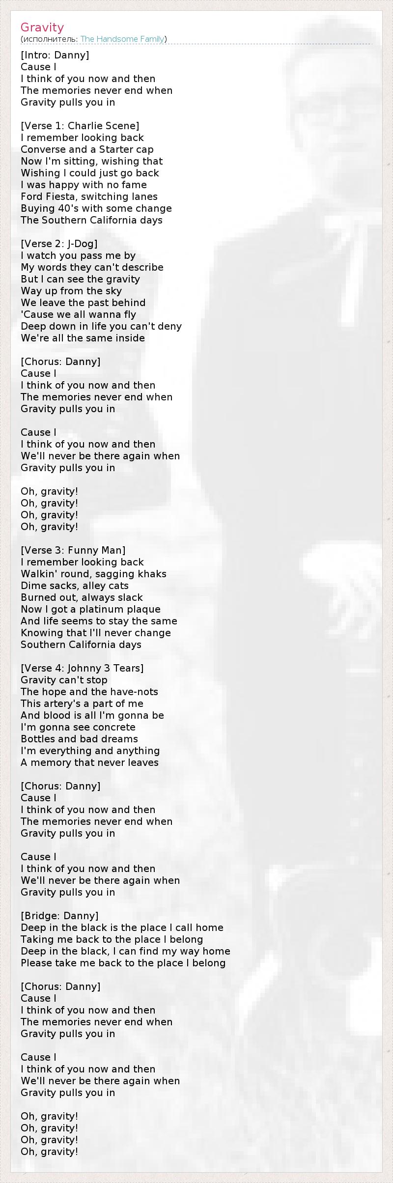[Вступление:] Ведь Порой я думаю о тебе. Воспоминаниям нет конца, когда Гравитация тянет к ним. [Куплет 1: Charlie Scene] Оглядываясь назад, вспоминаю Конверсы 1 и кепку Стартер. 2 Вот сижу и думаю, Что просто хочу вернуться назад. Без славы я был счастлив. Гонял на Форд Фиеста, 3 На сдачу покупал пивка. 4 Вернуть бы те деньки в Южной Калифорнии. [Куплет 2: J-Dog] Я вижу, как ты проходишь мимо, Словами не описать мои эмоции. Но я чувствую, как притяжение Возвращает меня с небес. 5 Мы оставляем прошлое позади, Ведь все хотим добиться чего-то впереди. И в глубине души невозможно отрицать, Что мы все одинаковы внутри. [Припев: Danny] Ведь Порой я думаю о тебе. Воспоминаниям нет конца, когда Гравитация тянет к ним. Ведь Порой я думаю о прошлом. Мы никогда в него не вернемся, Как бы нас ни затягивала гравитация. О, гравитация! О, гравитация! О, гравитация! О, гравитация! [Куплет 3: Funny Man] Оглядываясь назад, вспоминаю, Как расхаживал в широких 6 хаки. Мешочки с травой, 7 бездомных котов. От безделья вечно уставший. Сейчас, я добился платиновой награды, И жизнь, кажется, так и останется однообразной, Зная, что я не никогда ничего не изменю И не верну дни в Южной Калифорнии. [Куплет 4: Johnny 3 Tears] Гравитацию не остановить. Надежда и нищета - Часть меня, как артерия И кровь, останутся навсегда. Я вижу бетон, Бутылки и дурные сны. Я помню все, И эти воспоминания никогда меня не покинут. [Припев: Danny] Ведь Порой я думаю о тебе. Воспоминаниям нет конца, когда Гравитация тянет к ним. Ведь Порой я думаю о прошлом. Мы никогда в него не вернемся, Как бы нас ни затягивала гравитация. [Переход: Danny] Где-то во тьме есть место, которое я называю домом, Воспоминания возвращают меня туда, где я нужен. Где-то во тьме, я могу найти путь домой. Пожалуйста, верните меня туда, где я нужен. [Припев: Danny] Ведь Порой я думаю о тебе. Воспоминаниям нет конца, когда Гравитация тянет к ним. Ведь Порой я думаю о прошлом. Мы никогда в него не вернемся, Как бы нас ни затягивала гравитация. О, гравитация! О, гравитация! О, гравитация! О, гравитация! 1 – Конверс (Converse) — американская компания, производящая обувь с начала XX века и наиболее известная своими кедами Chuck Taylor All-Stars. 2 – Стартер (Starter) – американский производитель толстовок, обуви и другого. 3 – Форд Фиеста (Ford Fiesta) - субкомпактный автомобиль, выпускаемый компанией Форд Мотор Компани (Ford Motor Company); switching lanes (сленг) – езда на автомобиле. 4 – 40's или 40 oz – размер большой бутылки пива. 5 – Игра слов. Воспоминания тянут его в прошлое, как гравитация (сила притяжения) тянет людей вниз. 6 – saggin' (сленг) – означает положение, в котором штаны приспущены и видна часть нижнего белья. 7 – dime sacks (сленг) – небольшое количество травы.
