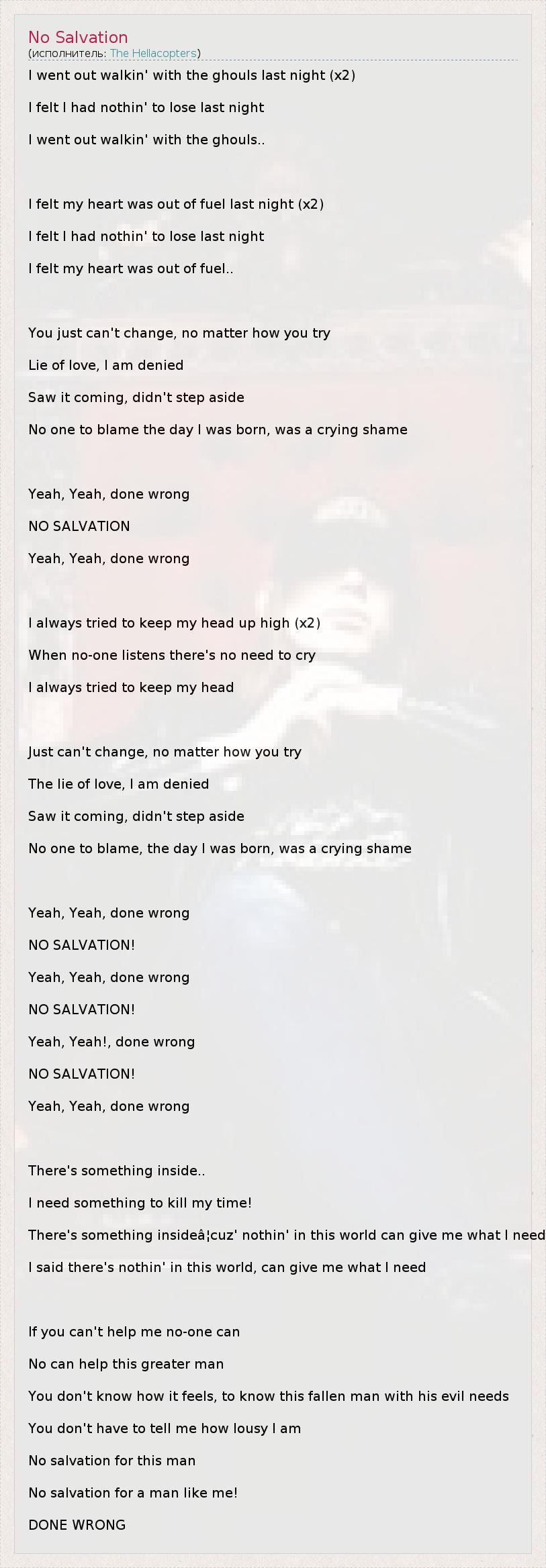 I went out walkin' with the ghouls last night (x2) I felt I had nothin' to lose last night I went out walkin' with the ghouls.. I felt my heart was out of fuel last night (x2) I felt I had nothin' to lose last night I felt my heart was out of fuel.. You just can't change, no matter how you try Lie of love, I am denied Saw it coming, didn't step aside No one to blame the day I was born, was a crying shame Yeah, Yeah, done wrong NO SALVATION Yeah, Yeah, done wrong I always tried to keep my head up high (x2) When no-one listens there's no need to cry I always tried to keep my head Just can't change, no matter how you try The lie of love, I am denied Saw it coming, didn't step aside No one to blame, the day I was born, was a crying shame Yeah, Yeah, done wrong NO SALVATION! Yeah, Yeah, done wrong NO SALVATION! Yeah, Yeah!, done wrong NO SALVATION! Yeah, Yeah, done wrong There's something inside.. I need something to kill my time! There's something insideâ¦cuz' nothin' in this world can give me what I need I said there's nothin' in this world, can give me what I need If you can't help me no-one can No can help this greater man You don't know how it feels, to know this fallen man with his evil needs You don't have to tell me how lousy I am No salvation for this man No salvation for a man like me! DONE WRONG