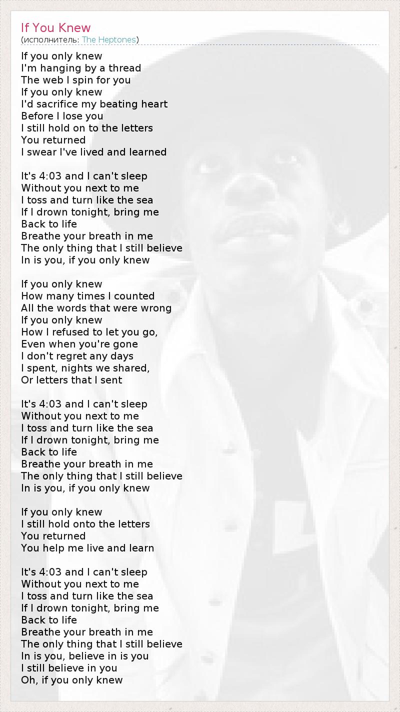 Если б ты только знала, Я вишу на ниточке, Паутине, что я плету для тебя, Если б ты только знала, Я бы пожертвовал своим сердцем Прежде, чем тебя потеряю Я по-прежнему держусь благодаря письмам, Которые ты вернула, Клянусь, что я жил и учился. Сейчас 4:03, а я не могу уснуть, Когда тебя нет рядом, Я беспокойный, словно море, Если я утону сегодня вечером, Верни меня к жизни, Вдохни своё дыхание в меня, Единственное, во что я всё ещё верю, Это ты, если б ты только знала... Если б ты только знала, Сколько раз я считал Все слова, что были неправильными, Если б ты только знала, Как я не хотел отпускать тебя, Даже когда ты уже ушла, Я не сожалею ни о днях, что провёл, Ни о ночах, что мы были вместе, Ни о письмах, которые я послал... Сейчас 4:03, а я не могу уснуть, Когда тебя нет рядом, Я беспокойный, словно море, Если я утону сегодня вечером, Верни меня к жизни, Вдохни своё дыхание в меня, Единственное, во что я всё ещё верю, Это ты, если б ты только знала... Если б ты только знала, Я по-прежнему держусь благодаря письмам, Что ты вернула, Ты помогаешь мне жить и учиться... Сейчас 4:03, а я не могу уснуть, Когда тебя нет рядом, Я беспокойный, словно море, Если я утону сегодня вечером, Верни меня к жизни, Вдохни своё дыхание в меня, Единственное, во что я всё ещё верю, Это ты, это ты, Я по-прежнему верю в тебя, О, если б ты только знала...