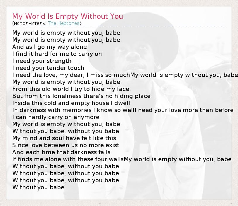 My world is empty without you, babe My world is empty without you, babe And as I go my way alone I find it hard for me to carry on I need your strength I need your tender touch I need the love, my dear, I miss so muchMy world is empty without you, babe My world is empty without you, babe From this old world I try to hide my face But from this loneliness there's no hiding place Inside this cold and empty house I dwell In darkness with memories I know so wellI need your love more than before I can hardly carry on anymore My world is empty without you, babe Without you babe, without you babe My mind and soul have felt like this Since love between us no more exist And each time that darkness falls If finds me alone with these four wallsMy world is empty without you, babe Without you babe, without you babe Without you babe, without you babe Without you babe, without you babe Without you babe