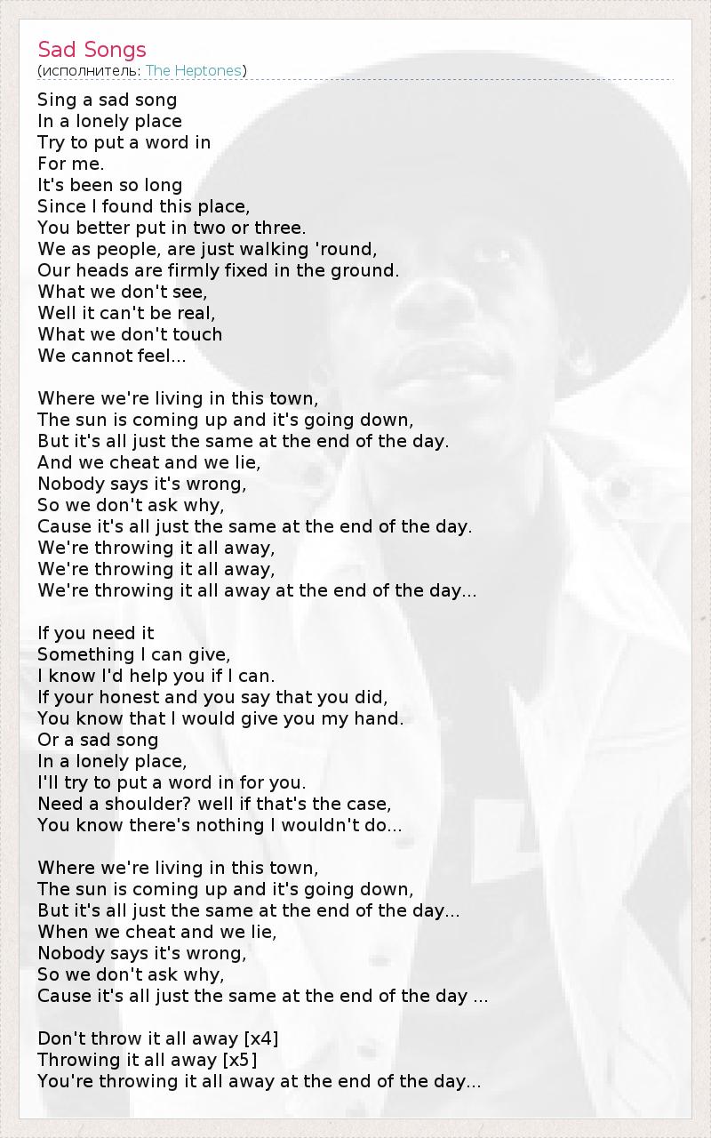 Sing a sad song In a lonely place Try to put a word in For me. It's been so long Since I found this place, You better put in two or three. We as people, are just walking 'round, Our heads are firmly fixed in the ground. What we don't see, Well it can't be real, What we don't touch We cannot feel... Where we're living in this town, The sun is coming up and it's going down, But it's all just the same at the end of the day. And we cheat and we lie, Nobody says it's wrong, So we don't ask why, Cause it's all just the same at the end of the day. We're throwing it all away, We're throwing it all away, We're throwing it all away at the end of the day... If you need it Something I can give, I know I'd help you if I can. If your honest and you say that you did, You know that I would give you my hand. Or a sad song In a lonely place, I'll try to put a word in for you. Need a shoulder? well if that's the case, You know there's nothing I wouldn't do... Where we're living in this town, The sun is coming up and it's going down, But it's all just the same at the end of the day... When we cheat and we lie, Nobody says it's wrong, So we don't ask why, Cause it's all just the same at the end of the day ... Don't throw it all away [x4] Throwing it all away [x5] You're throwing it all away at the end of the day...