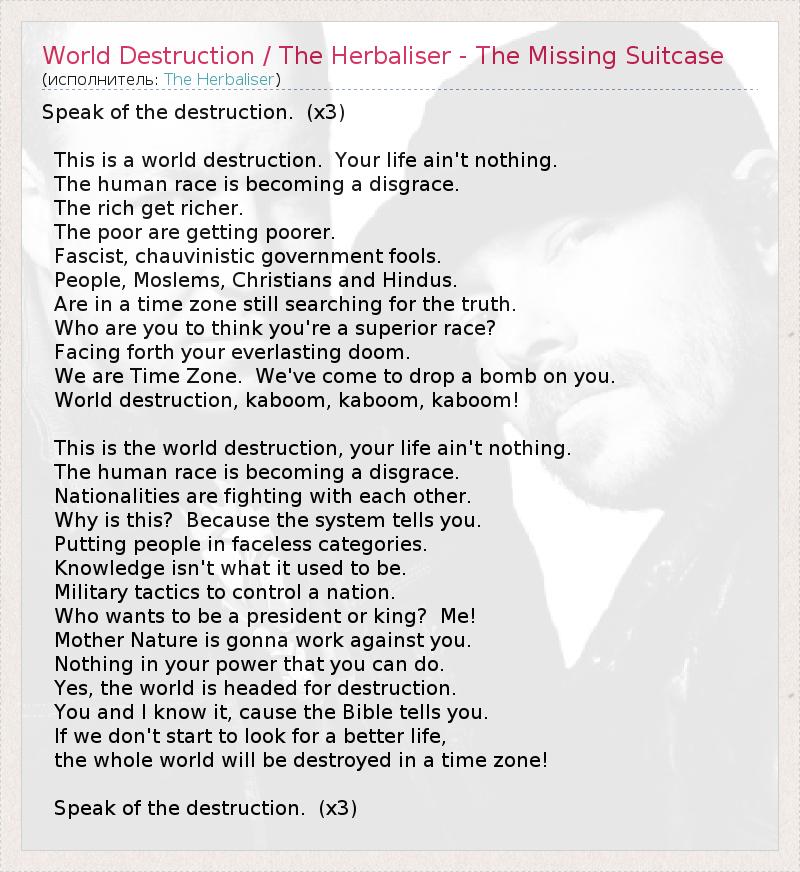 А как ты думаешь, о чем песня "World Destruction / The Herbaliser - The Missing Suitcase" ?