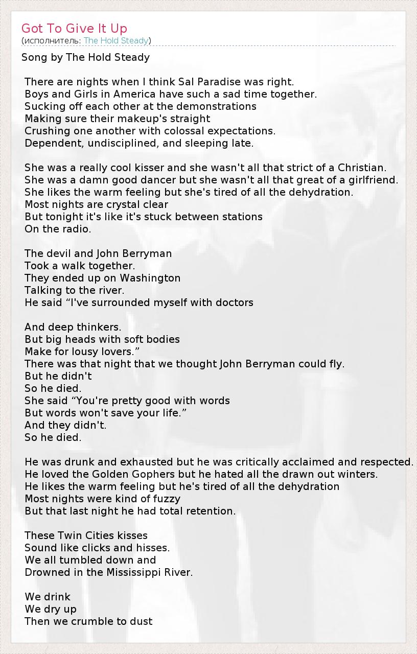 Это интересно:The Hold Steady считается альтернативная группой из Бруклина, хотя четверо из пяти музыкантов живут в Миннеаполисе (эта тема, кстати, часто отражается в их песнях). Легенда о создании группы хлещет банальностью: Тэд Каблер и Крейг Финн сидели на диване и смотрели запись старого фестиваля The Last Waltz и Крейг заявил: "Чувак, почему больше нету таких групп, а? Давай создадим такую группу!". Первый... продолжение