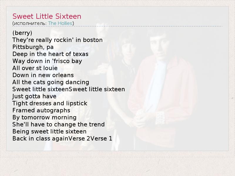 (berry) They're really rockin' in boston Pittsburgh, pa Deep in the heart of texas Way down in 'frisco bay All over st louie Down in new orleans All the cats going dancing Sweet little sixteenSweet little sixteen Just gotta have Tight dresses and lipstick Framed autographs By tomorrow morning She'll have to change the trend Being sweet little sixteen Back in class againVerse 2Verse 1