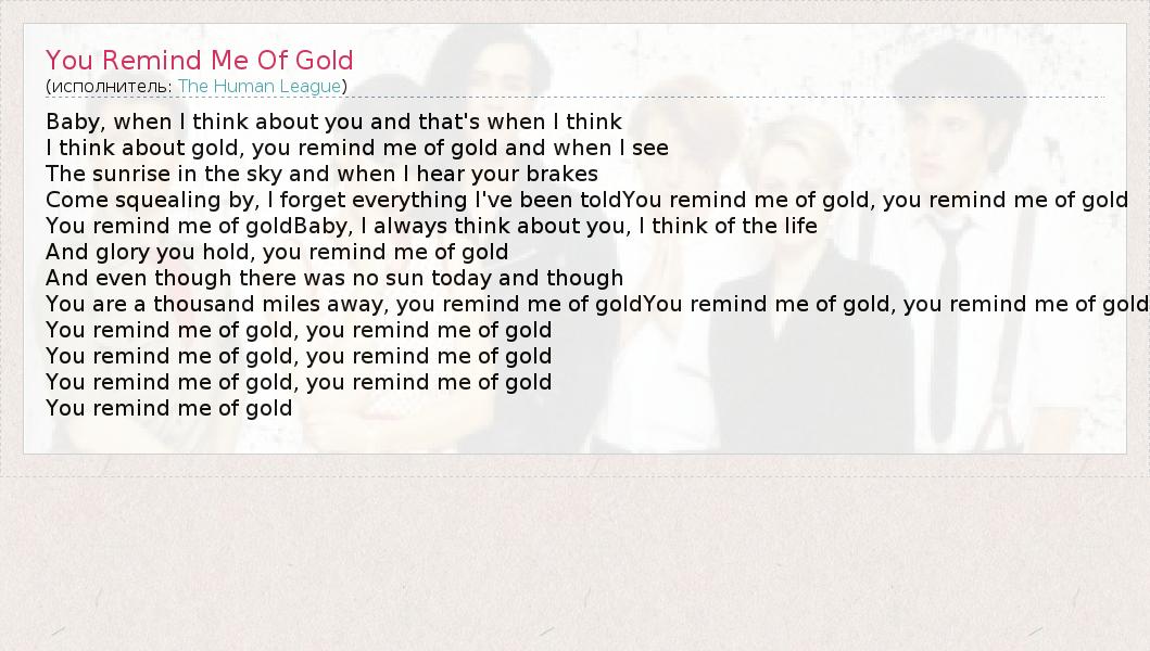 Baby, when I think about you and that's when I think I think about gold, you remind me of gold and when I see The sunrise in the sky and when I hear your brakes Come squealing by, I forget everything I've been toldYou remind me of gold, you remind me of gold You remind me of goldBaby, I always think about you, I think of the life And glory you hold, you remind me of gold And even though there was no sun today and though You are a thousand miles away, you remind me of goldYou remind me of gold, you remind me of gold You remind me of gold, you remind me of gold You remind me of gold, you remind me of gold You remind me of gold, you remind me of gold You remind me of gold