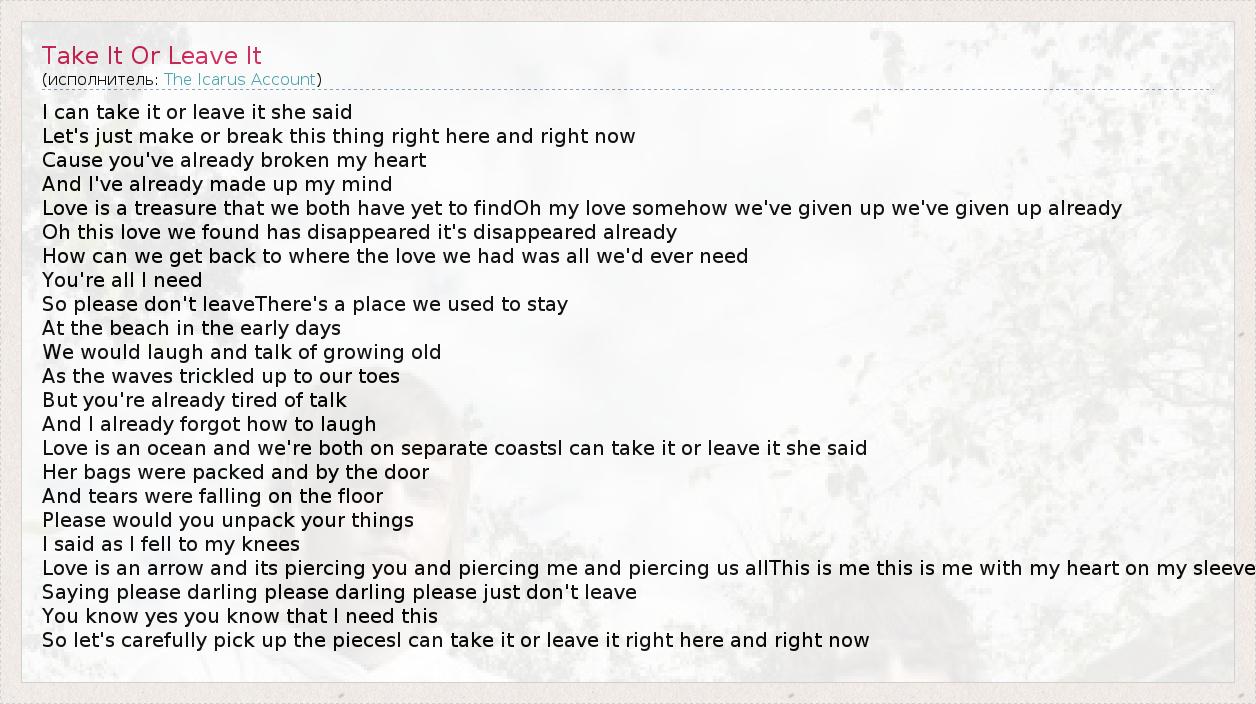 А как ты думаешь, о чем песня "Take It Or Leave It" ?