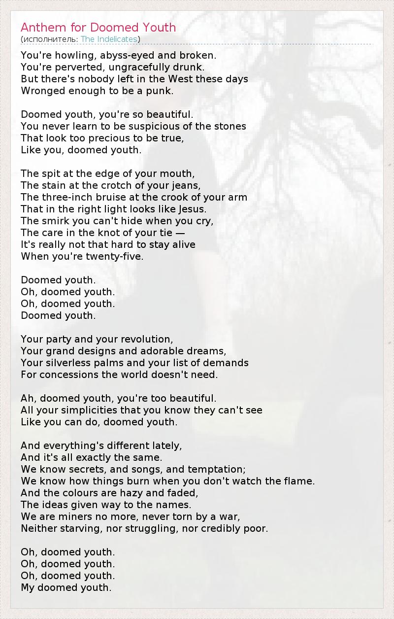 You're howling, abyss-eyed and broken. You're perverted, ungracefully drunk. But there's nobody left in the West these days Wronged enough to be a punk. Doomed youth, you're so beautiful. You never learn to be suspicious of the stones That look too precious to be true, Like you, doomed youth. The spit at the edge of your mouth, The stain at the crotch of your jeans, The three-inch bruise at the crook of your arm That in the right light looks like Jesus. The smirk you can't hide when you cry, The care in the knot of your tie — It's really not that hard to stay alive When you're twenty-five. Doomed youth. Oh, doomed youth. Oh, doomed youth. Doomed youth. Your party and your revolution, Your grand designs and adorable dreams, Your silverless palms and your list of demands For concessions the world doesn't need. Ah, doomed youth, you're too beautiful. All your simplicities that you know they can't see Like you can do, doomed youth. And everything's different lately, And it's all exactly the same. We know secrets, and songs, and temptation; We know how things burn when you don't watch the flame. And the colours are hazy and faded, The ideas given way to the names. We are miners no more, never torn by a war, Neither starving, nor struggling, nor credibly poor. Oh, doomed youth. Oh, doomed youth. Oh, doomed youth. My doomed youth.