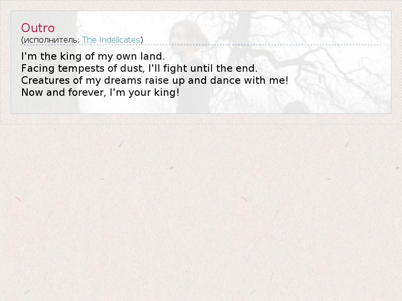 I'm the king of my own land. Facing tempests of dust, I'll fight until the end. Creatures of my dreams raise up and dance with me! Now and forever, I'm your king!