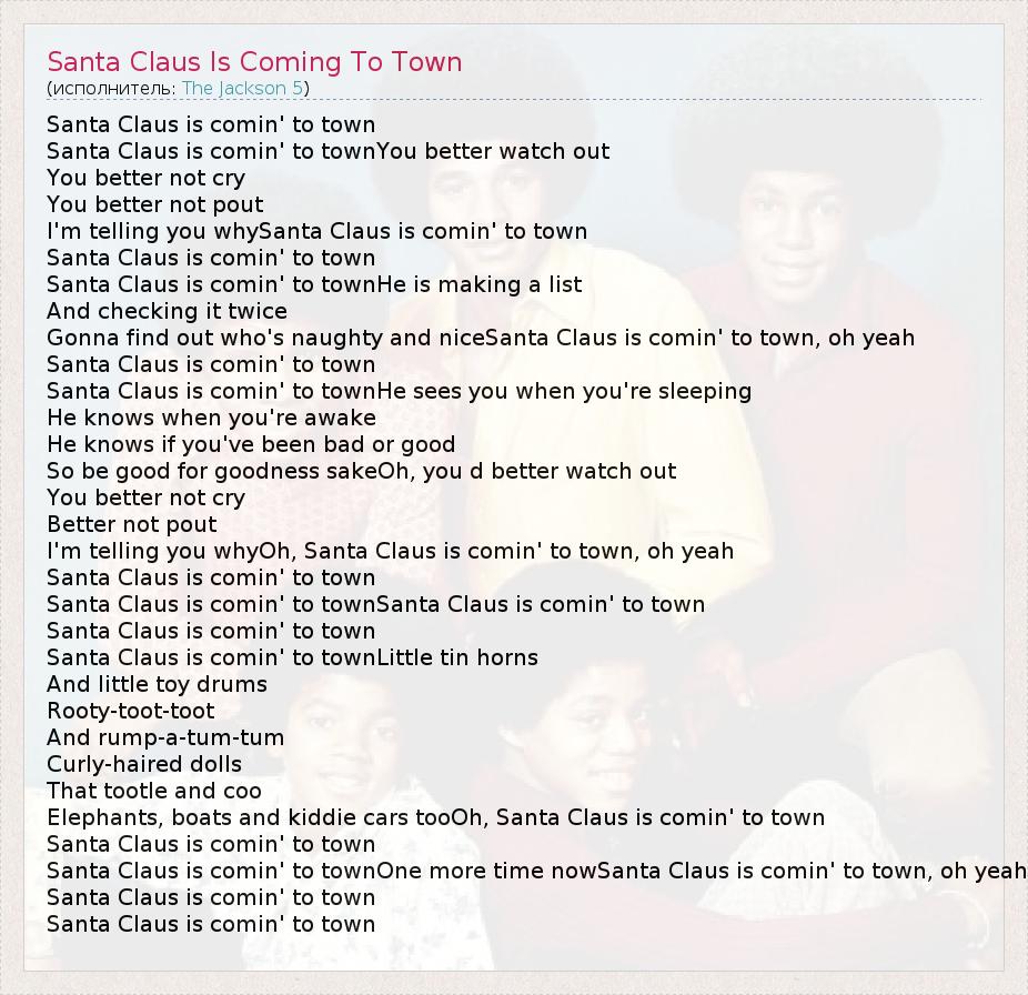 Gonna find out who's naughty and niceSanta Claus is comin' to town, oh yeah