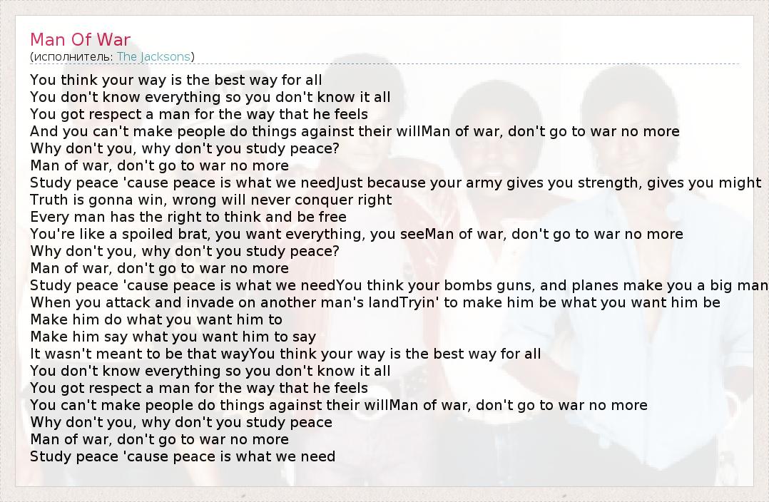 You're like a spoiled brat, you want everything, you seeMan of war, don't go to war no more