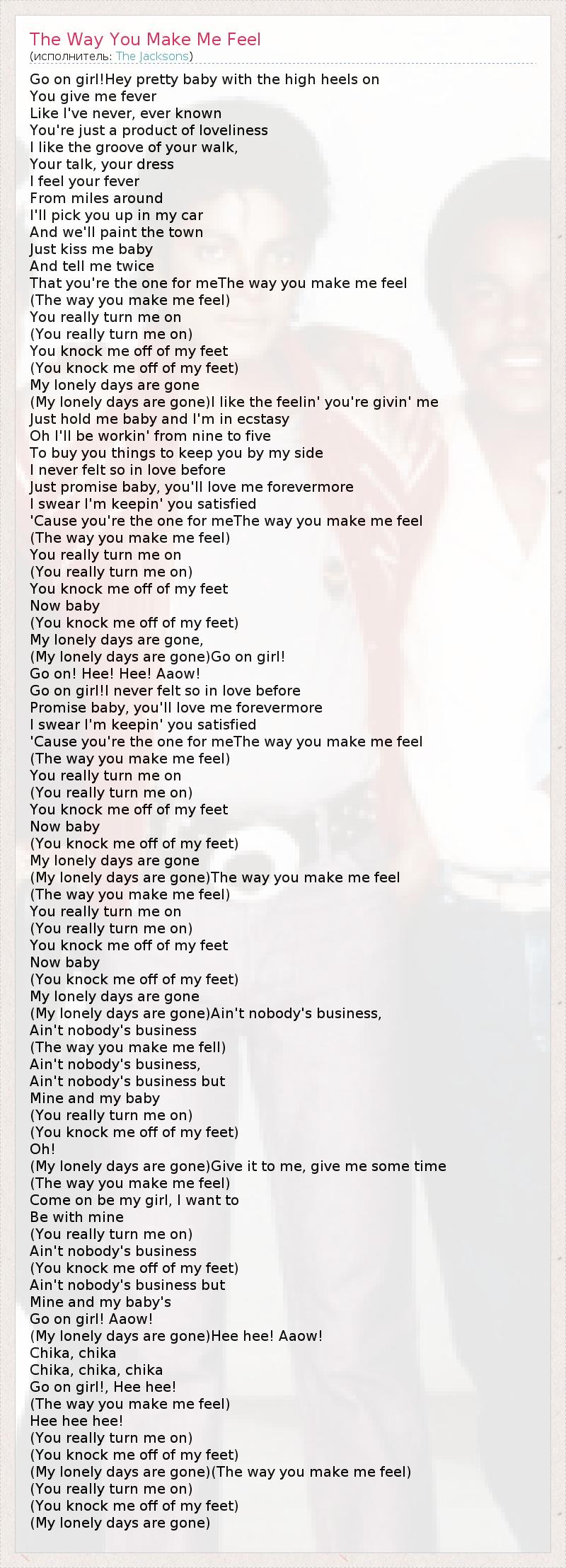 Go on girl!Hey pretty baby with the high heels on You give me fever Like I've never, ever known You're just a product of loveliness I like the groove of your walk, Your talk, your dress I feel your fever From miles around I'll pick you up in my car And we'll paint the town Just kiss me baby And tell me twice That you're the one for meThe way you make me feel (The way you make me feel) You really turn me on (You really turn me on) You knock me off of my feet (You knock me off of my feet) My lonely days are gone (My lonely days are gone)I like the feelin' you're givin' me Just hold me baby and I'm in ecstasy Oh I'll be workin' from nine to five To buy you things to keep you by my side I never felt so in love before Just promise baby, you'll love me forevermore I swear I'm keepin' you satisfied 'Cause you're the one for meThe way you make me feel (The way you make me feel) You really turn me on (You really turn me on) You knock me off of my feet Now baby (You knock me off of my feet) My lonely days are gone, (My lonely days are gone)Go on girl! Go on! Hee! Hee! Aaow! Go on girl!I never felt so in love before Promise baby, you'll love me forevermore I swear I'm keepin' you satisfied 'Cause you're the one for meThe way you make me feel (The way you make me feel) You really turn me on (You really turn me on) You knock me off of my feet Now baby (You knock me off of my feet) My lonely days are gone (My lonely days are gone)The way you make me feel (The way you make me feel) You really turn me on (You really turn me on) You knock me off of my feet Now baby (You knock me off of my feet) My lonely days are gone (My lonely days are gone)Ain't nobody's business, Ain't nobody's business (The way you make me fell) Ain't nobody's business, Ain't nobody's business but Mine and my baby (You really turn me on) (You knock me off of my feet) Oh! (My lonely days are gone)Give it to me, give me some time (The way you make me feel) Come on be my girl, I want to Be with mine (You really turn me on) Ain't nobody's business (You knock me off of my feet) Ain't nobody's business but Mine and my baby's Go on girl! Aaow! (My lonely days are gone)Hee hee! Aaow! Chika, chika Chika, chika, chika Go on girl!, Hee hee! (The way you make me feel) Hee hee hee! (You really turn me on) (You knock me off of my feet) (My lonely days are gone)(The way you make me feel) (You really turn me on) (You knock me off of my feet) (My lonely days are gone)
