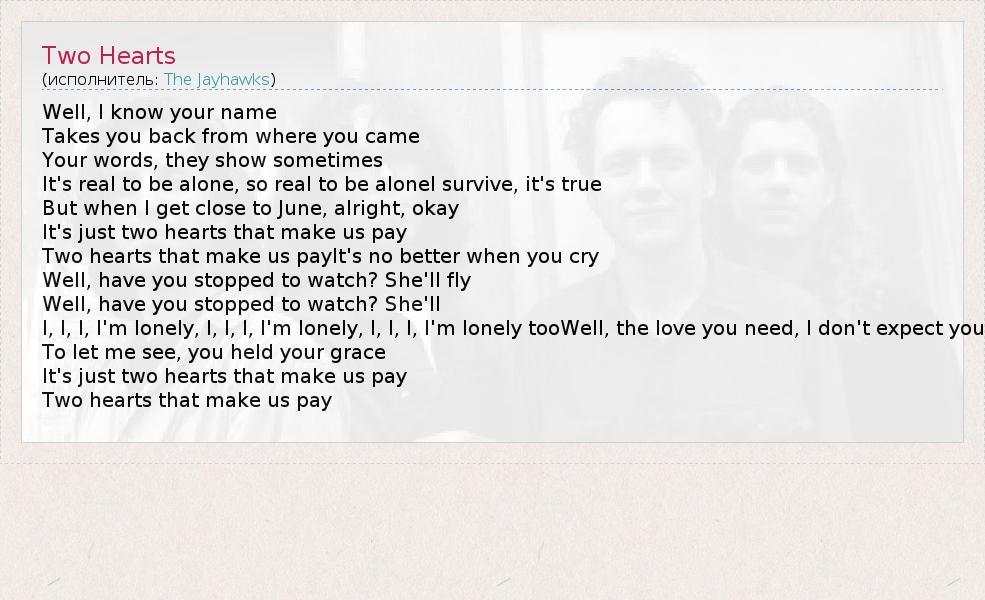 А как ты думаешь, о чем песня "Two Hearts" ?