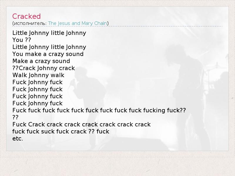 Little Johnny little Johnny You ?? Little Johnny little Johnny You make a crazy sound Make a crazy sound ??Crack Johnny crack Walk Johnny walk Fuck Johnny fuck Fuck Johnny fuck Fuck Johnny fuck Fuck Johnny fuck Fuck fuck fuck fuck fuck fuck fuck fuck fuck fucking fuck?? ?? Fuck Crack crack crack crack crack crack crack fuck fuck suck fuck crack ?? fuck etc.