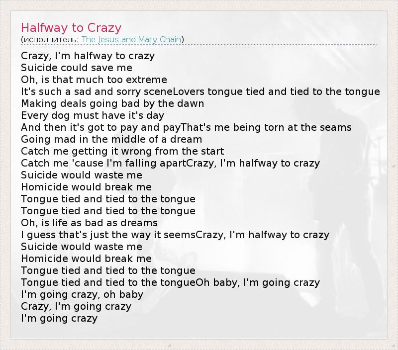 Crazy, I'm halfway to crazy Suicide could save me Oh, is that much too extreme It's such a sad and sorry sceneLovers tongue tied and tied to the tongue Making deals going bad by the dawn Every dog must have it's day And then it's got to pay and payThat's me being torn at the seams Going mad in the middle of a dream Catch me getting it wrong from the start Catch me 'cause I'm falling apartCrazy, I'm halfway to crazy Suicide would waste me Homicide would break me Tongue tied and tied to the tongue Tongue tied and tied to the tongue Oh, is life as bad as dreams I guess that's just the way it seemsCrazy, I'm halfway to crazy Suicide would waste me Homicide would break me Tongue tied and tied to the tongue Tongue tied and tied to the tongueOh baby, I'm going crazy I'm going crazy, oh baby Crazy, I'm going crazy I'm going crazy