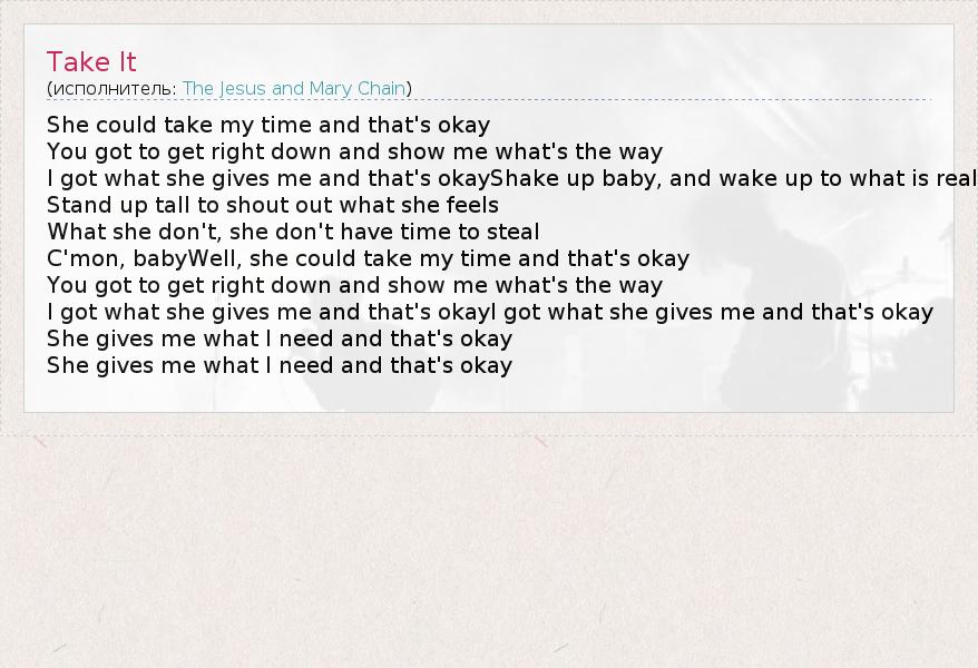 She could take my time and that's okay You got to get right down and show me what's the way I got what she gives me and that's okayShake up baby, and wake up to what is real Stand up tall to shout out what she feels What she don't, she don't have time to steal C'mon, babyWell, she could take my time and that's okay You got to get right down and show me what's the way I got what she gives me and that's okayI got what she gives me and that's okay She gives me what I need and that's okay She gives me what I need and that's okay