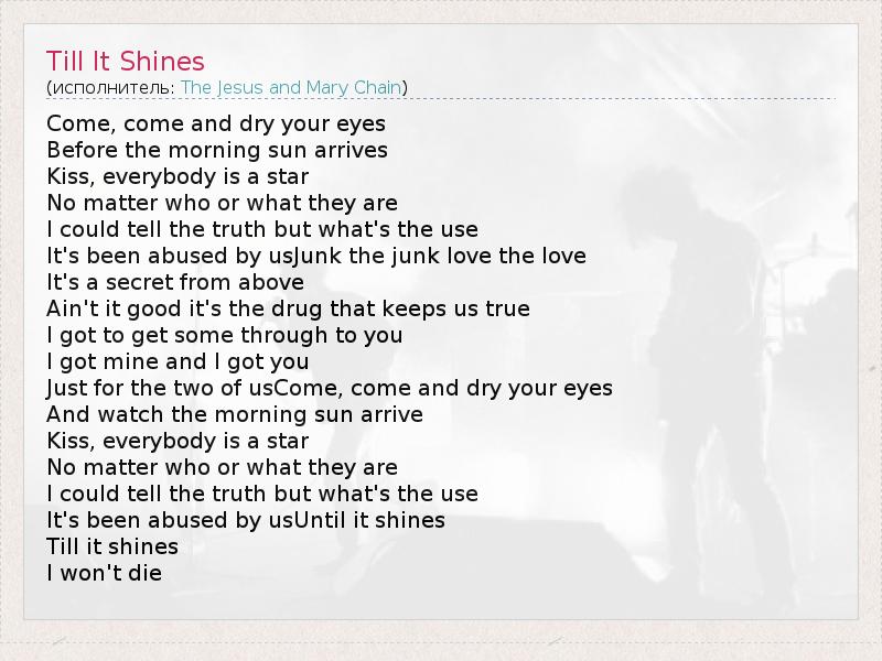 Come, come and dry your eyes Before the morning sun arrives Kiss, everybody is a star No matter who or what they are I could tell the truth but what's the use It's been abused by usJunk the junk love the love It's a secret from above Ain't it good it's the drug that keeps us true I got to get some through to you I got mine and I got you Just for the two of usCome, come and dry your eyes And watch the morning sun arrive Kiss, everybody is a star No matter who or what they are I could tell the truth but what's the use It's been abused by usUntil it shines Till it shines I won't die