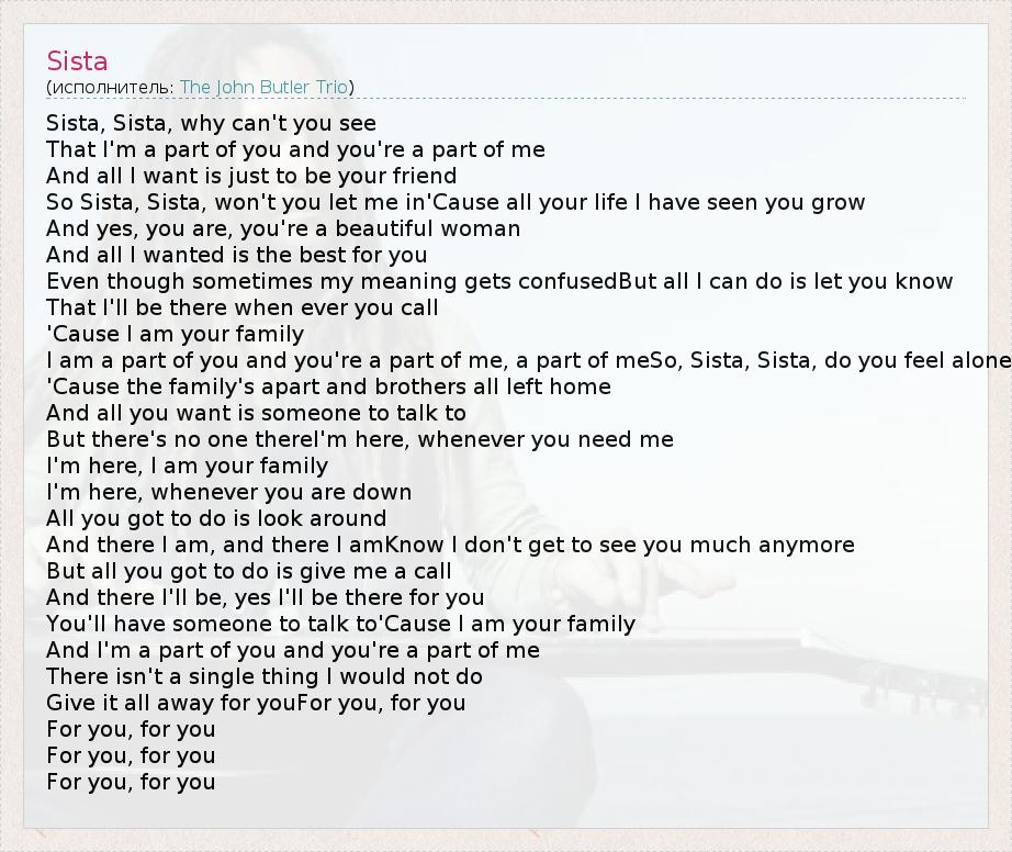 Sista, Sista, why can't you see That I'm a part of you and you're a part of me And all I want is just to be your friend So Sista, Sista, won't you let me in'Cause all your life I have seen you grow And yes, you are, you're a beautiful woman And all I wanted is the best for you Even though sometimes my meaning gets confusedBut all I can do is let you know That I'll be there when ever you call 'Cause I am your family I am a part of you and you're a part of me, a part of meSo, Sista, Sista, do you feel alone 'Cause the family's apart and brothers all left home And all you want is someone to talk to But there's no one thereI'm here, whenever you need me I'm here, I am your family I'm here, whenever you are down All you got to do is look around And there I am, and there I amKnow I don't get to see you much anymore But all you got to do is give me a call And there I'll be, yes I'll be there for you You'll have someone to talk to'Cause I am your family And I'm a part of you and you're a part of me There isn't a single thing I would not do Give it all away for youFor you, for you For you, for you For you, for you For you, for you