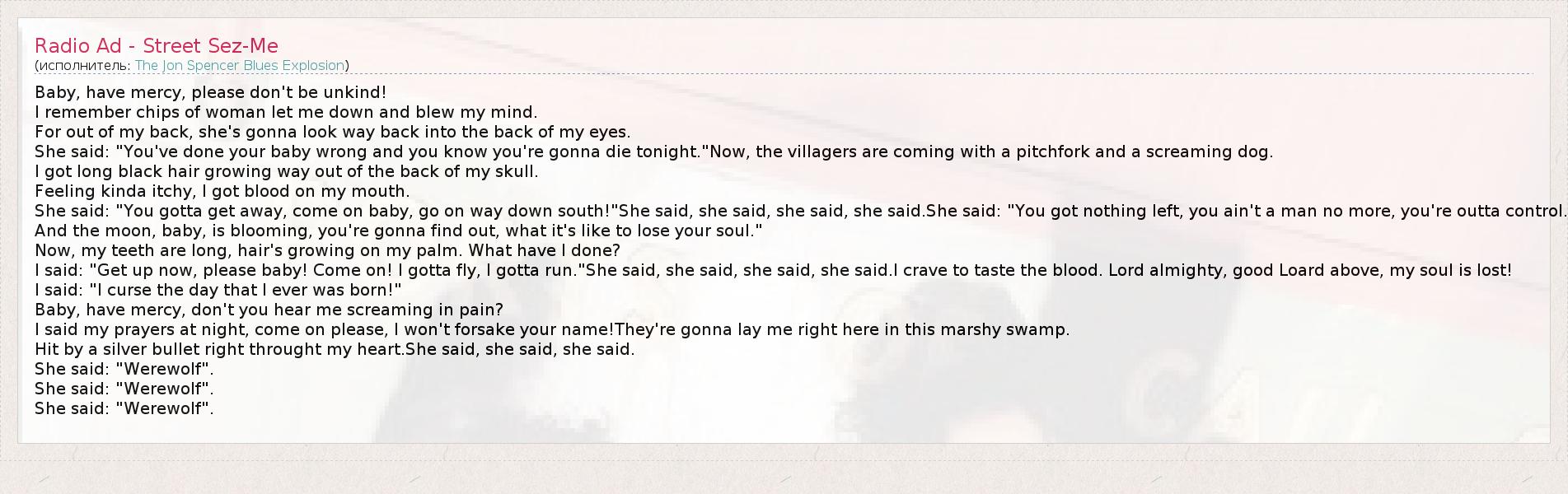 Baby, have mercy, please don't be unkind! I remember chips of woman let me down and blew my mind. For out of my back, she's gonna look way back into the back of my eyes. She said: "You've done your baby wrong and you know you're gonna die tonight."Now, the villagers are coming with a pitchfork and a screaming dog. I got long black hair growing way out of the back of my skull. Feeling kinda itchy, I got blood on my mouth. She said: "You gotta get away, come on baby, go on way down south!"She said, she said, she said, she said.She said: "You got nothing left, you ain't a man no more, you're outta control. And the moon, baby, is blooming, you're gonna find out, what it's like to lose your soul." Now, my teeth are long, hair's growing on my palm. What have I done? I said: "Get up now, please baby! Come on! I gotta fly, I gotta run."She said, she said, she said, she said.I crave to taste the blood. Lord almighty, good Loard above, my soul is lost! I said: "I curse the day that I ever was born!" Baby, have mercy, don't you hear me screaming in pain? I said my prayers at night, come on please, I won't forsake your name!They're gonna lay me right here in this marshy swamp. Hit by a silver bullet right throught my heart.She said, she said, she said. She said: "Werewolf". She said: "Werewolf". She said: "Werewolf".