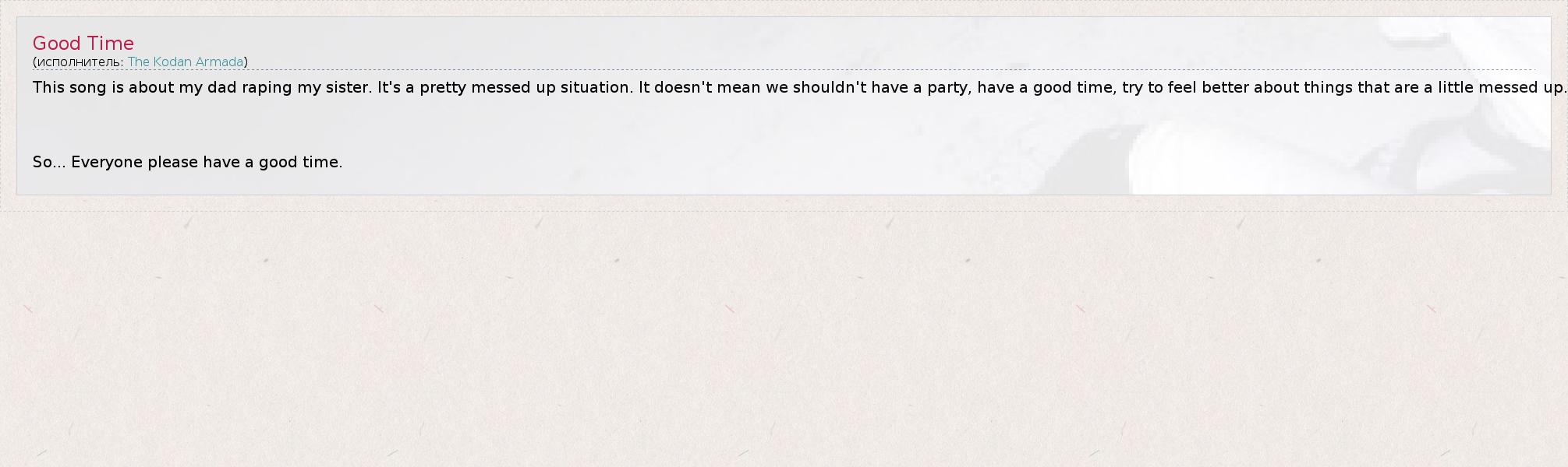 This song is about my dad raping my sister. It's a pretty messed up situation. It doesn't mean we shouldn't have a party, have a good time, try to feel better about things that are a little messed up.