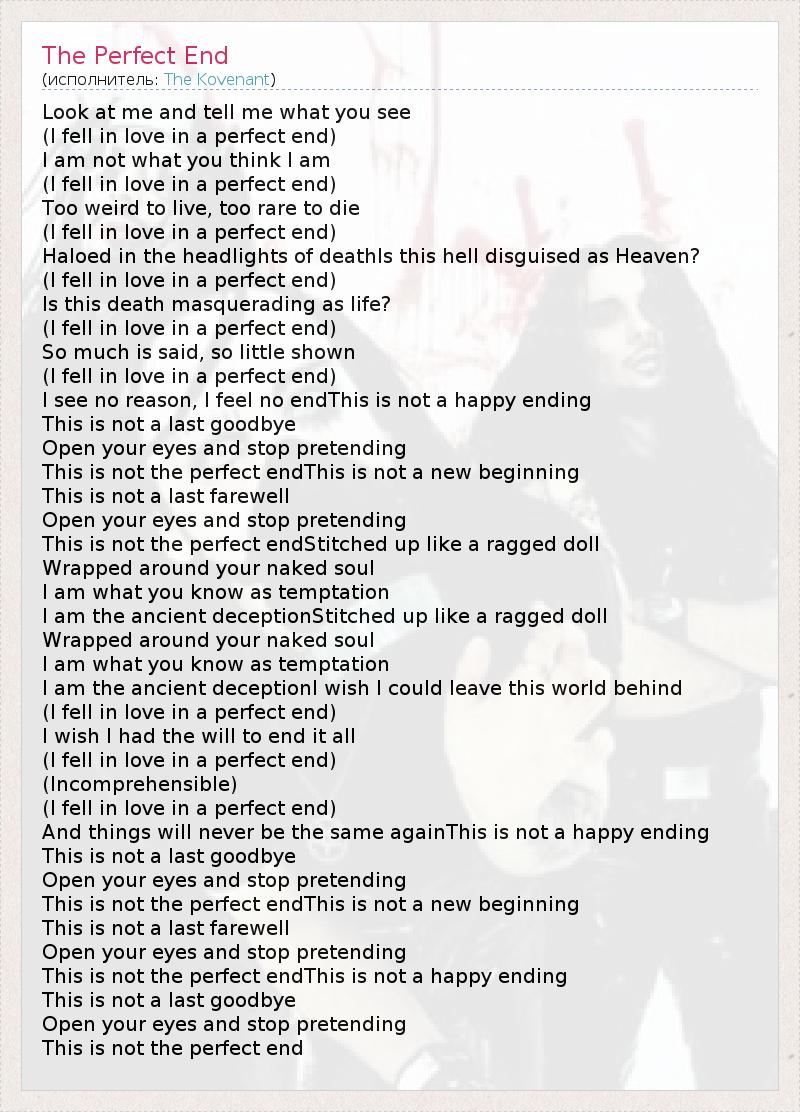 Look at me and tell me what you see (I fell in love in a perfect end) I am not what you think I am (I fell in love in a perfect end) Too weird to live, too rare to die (I fell in love in a perfect end) Haloed in the headlights of deathIs this hell disguised as Heaven? (I fell in love in a perfect end) Is this death masquerading as life? (I fell in love in a perfect end) So much is said, so little shown (I fell in love in a perfect end) I see no reason, I feel no endThis is not a happy ending This is not a last goodbye Open your eyes and stop pretending This is not the perfect endThis is not a new beginning This is not a last farewell Open your eyes and stop pretending This is not the perfect endStitched up like a ragged doll Wrapped around your naked soul I am what you know as temptation I am the ancient deceptionStitched up like a ragged doll Wrapped around your naked soul I am what you know as temptation I am the ancient deceptionI wish I could leave this world behind (I fell in love in a perfect end) I wish I had the will to end it all (I fell in love in a perfect end) (Incomprehensible) (I fell in love in a perfect end) And things will never be the same againThis is not a happy ending This is not a last goodbye Open your eyes and stop pretending This is not the perfect endThis is not a new beginning This is not a last farewell Open your eyes and stop pretending This is not the perfect endThis is not a happy ending This is not a last goodbye Open your eyes and stop pretending This is not the perfect end