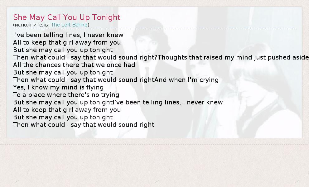 ГлавнаяИсполнителиThe Left BankeShe May Call You Up Tonight