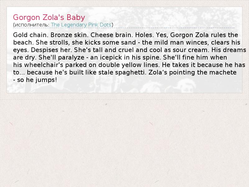 А как ты думаешь, о чем песня "Gorgon Zola's Baby" ?