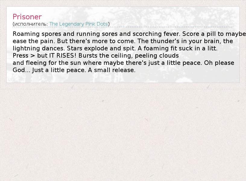 Roaming spores and running sores and scorching fever. Score a pill to maybe ease the pain. But there's more to come. The thunder's in your brain, the lightning dances. Stars explode and spit. A foaming fit suck in a litt. Press > but IT RISES! Bursts the ceiling, peeling clouds and fleeing for the sun where maybe there's just a little peace. Oh please God... Just a little peace. A small release.