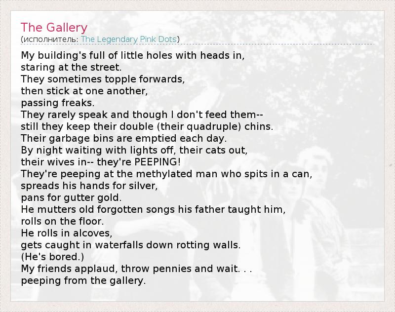 Это интересно:The Legendary Pink Dots (LPD) - музыкальный коллектив, основанный в 1980 году в Лондоне, Великобритания и примерно через полгода переехавший в Амстердам, где и была написана большая часть его музыки. На счету группы около 40 альбомов.По официальной версии свое название группа получила благодаря старому пианино 1908 года, которое стояло в студии. Его клавиши по неизвестной причине были покрыты пятнами... продолжение