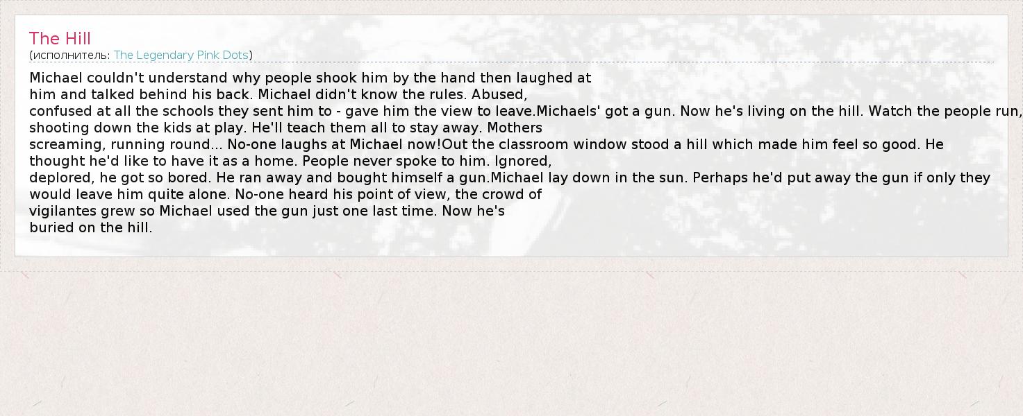 Michael couldn't understand why people shook him by the hand then laughed at him and talked behind his back. Michael didn't know the rules. Abused, confused at all the schools they sent him to - gave him the view to leave.Michaels' got a gun. Now he's living on the hill. Watch the people run, shooting down the kids at play. He'll teach them all to stay away. Mothers screaming, running round... No-one laughs at Michael now!Out the classroom window stood a hill which made him feel so good. He thought he'd like to have it as a home. People never spoke to him. Ignored, deplored, he got so bored. He ran away and bought himself a gun.Michael lay down in the sun. Perhaps he'd put away the gun if only they would leave him quite alone. No-one heard his point of view, the crowd of vigilantes grew so Michael used the gun just one last time. Now he's buried on the hill.