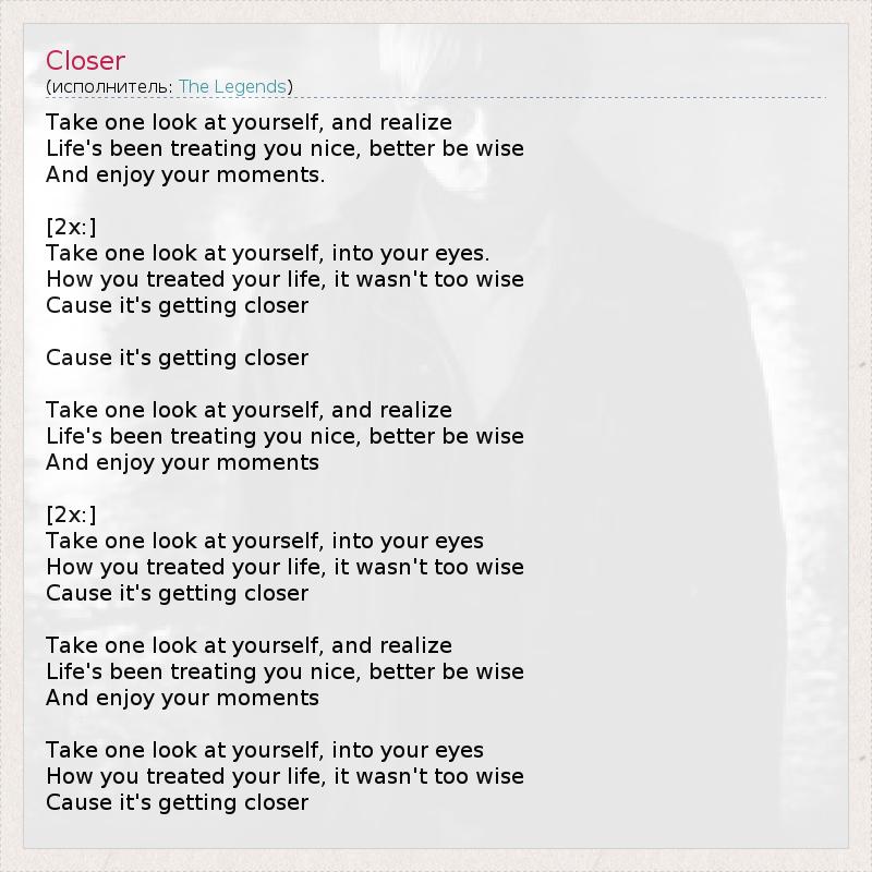 Take one look at yourself, and realize Life's been treating you nice, better be wise And enjoy your moments. [2x:] Take one look at yourself, into your eyes. How you treated your life, it wasn't too wise Cause it's getting closer Cause it's getting closer Take one look at yourself, and realize Life's been treating you nice, better be wise And enjoy your moments [2x:] Take one look at yourself, into your eyes How you treated your life, it wasn't too wise Cause it's getting closer Take one look at yourself, and realize Life's been treating you nice, better be wise And enjoy your moments Take one look at yourself, into your eyes How you treated your life, it wasn't too wise Cause it's getting closer