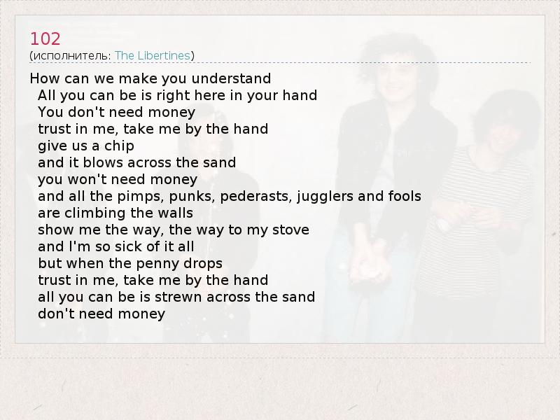 Это интересно:Участники группы The Libertines - англичане, играющие в стиле punk revival. Группа сформировалась в Великобритании, Лондон в 1997 и распалась в 2004 . Позже они воссоединились в 2010 , чтобы участвовать в Reading и Leeds festivals. В 2014 году после очередного ряда выступлений группа сообщила об окончательном воссоединении и планах выпустить новую пластинку. Группа выпустила два... продолжение
