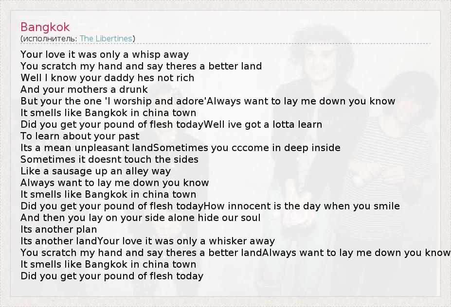 Your love it was only a whisp away You scratch my hand and say theres a better land Well I know your daddy hes not rich And your mothers a drunk But your the one 'I worship and adore'Always want to lay me down you know It smells like Bangkok in china town Did you get your pound of flesh todayWell ive got a lotta learn To learn about your past Its a mean unpleasant landSometimes you cccome in deep inside Sometimes it doesnt touch the sides Like a sausage up an alley way Always want to lay me down you know It smells like Bangkok in china town Did you get your pound of flesh todayHow innocent is the day when you smile And then you lay on your side alone hide our soul Its another plan Its another landYour love it was only a whisker away You scratch my hand and say theres a better landAlways want to lay me down you know It smells like Bangkok in china town Did you get your pound of flesh today