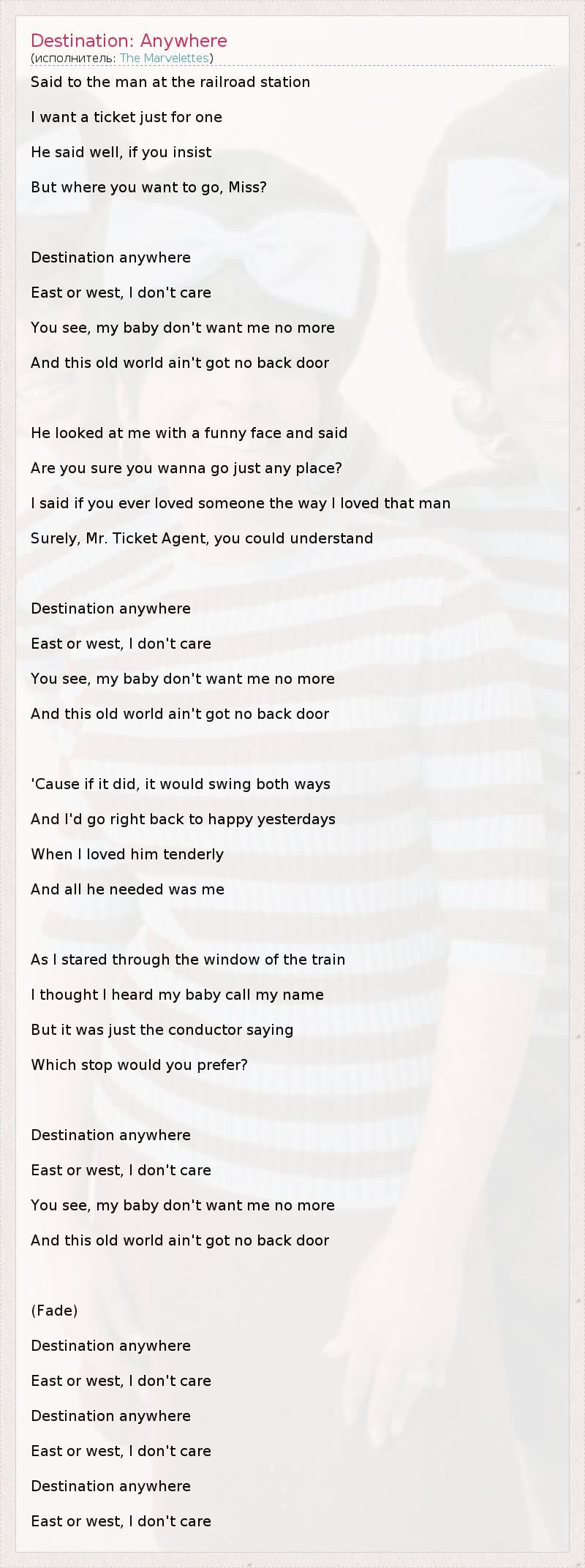 Said to the man at the railroad station I want a ticket just for one He said well, if you insist But where you want to go, Miss? Destination anywhere East or west, I don't care You see, my baby don't want me no more And this old world ain't got no back door He looked at me with a funny face and said Are you sure you wanna go just any place? I said if you ever loved someone the way I loved that man Surely, Mr. Ticket Agent, you could understand Destination anywhere East or west, I don't care You see, my baby don't want me no more And this old world ain't got no back door 'Cause if it did, it would swing both ways And I'd go right back to happy yesterdays When I loved him tenderly And all he needed was me As I stared through the window of the train I thought I heard my baby call my name But it was just the conductor saying Which stop would you prefer? Destination anywhere East or west, I don't care You see, my baby don't want me no more And this old world ain't got no back door (Fade) Destination anywhere East or west, I don't care Destination anywhere East or west, I don't care Destination anywhere East or west, I don't care