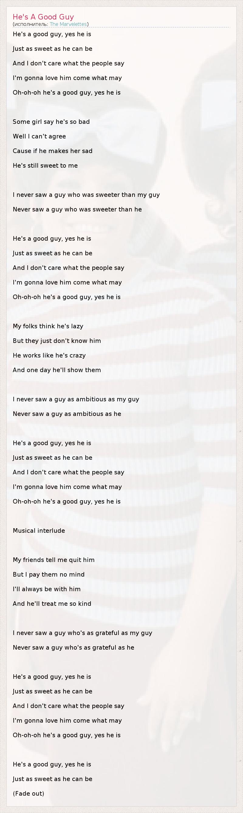 He's a good guy, yes he is Just as sweet as he can be And I don't care what the people say I'm gonna love him come what may Oh-oh-oh he's a good guy, yes he is Some girl say he's so bad Well I can't agree Cause if he makes her sad He's still sweet to me I never saw a guy who was sweeter than my guy Never saw a guy who was sweeter than he He's a good guy, yes he is Just as sweet as he can be And I don't care what the people say I'm gonna love him come what may Oh-oh-oh he's a good guy, yes he is My folks think he's lazy But they just don't know him He works like he's crazy And one day he'll show them I never saw a guy as ambitious as my guy Never saw a guy as ambitious as he He's a good guy, yes he is Just as sweet as he can be And I don't care what the people say I'm gonna love him come what may Oh-oh-oh he's a good guy, yes he is Musical interlude My friends tell me quit him But I pay them no mind I'll always be with him And he'll treat me so kind I never saw a guy who's as grateful as my guy Never saw a guy who's as grateful as he He's a good guy, yes he is Just as sweet as he can be And I don't care what the people say I'm gonna love him come what may Oh-oh-oh he's a good guy, yes he is He's a good guy, yes he is Just as sweet as he can be (Fade out)