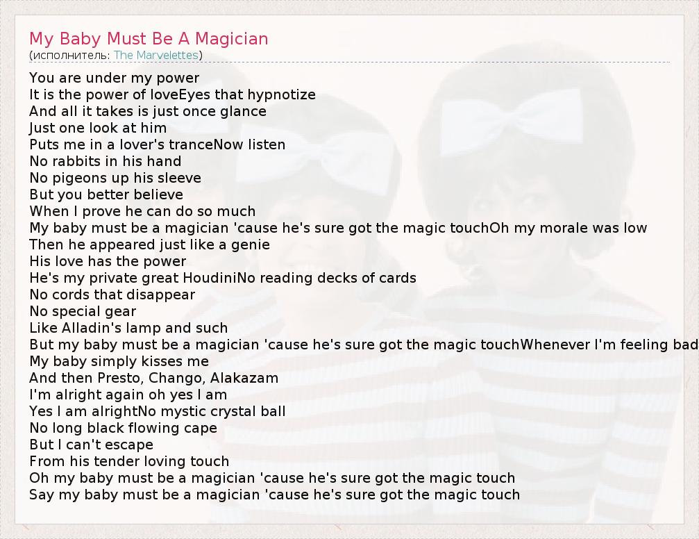 My baby must be a magician 'cause he's sure got the magic touchOh my morale was low