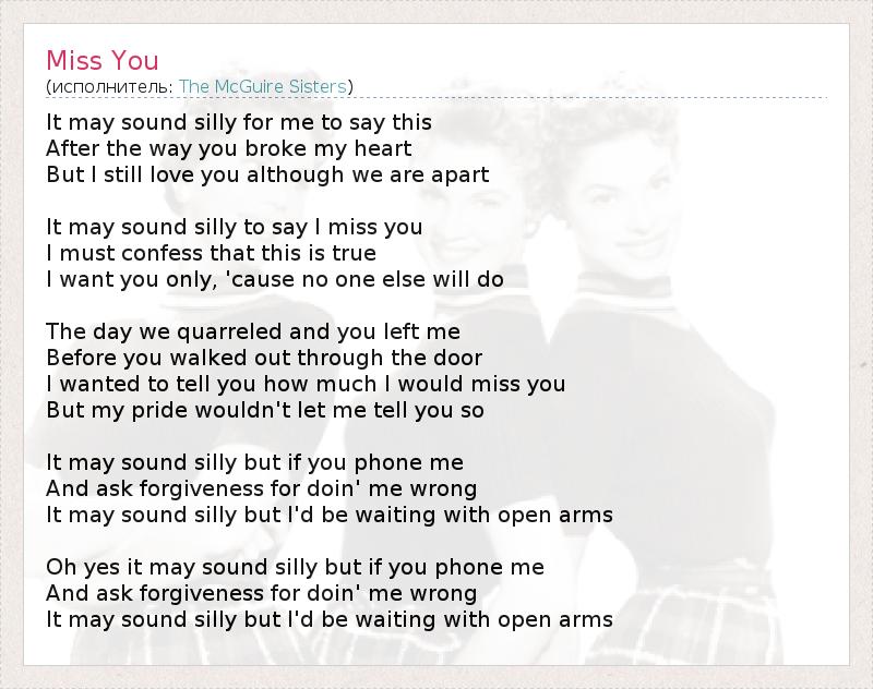 It may sound silly for me to say this After the way you broke my heart But I still love you although we are apart It may sound silly to say I miss you I must confess that this is true I want you only, 'cause no one else will do The day we quarreled and you left me Before you walked out through the door I wanted to tell you how much I would miss you But my pride wouldn't let me tell you so It may sound silly but if you phone me And ask forgiveness for doin' me wrong It may sound silly but I'd be waiting with open arms Oh yes it may sound silly but if you phone me And ask forgiveness for doin' me wrong It may sound silly but I'd be waiting with open arms