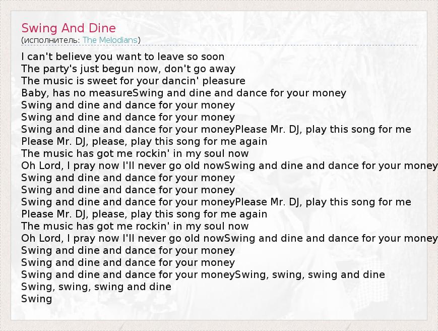 I can't believe you want to leave so soon The party's just begun now, don't go away The music is sweet for your dancin' pleasure Baby, has no measureSwing and dine and dance for your money Swing and dine and dance for your money Swing and dine and dance for your money Swing and dine and dance for your moneyPlease Mr. DJ, play this song for me Please Mr. DJ, please, play this song for me again The music has got me rockin' in my soul now Oh Lord, I pray now I'll never go old nowSwing and dine and dance for your money Swing and dine and dance for your money Swing and dine and dance for your money Swing and dine and dance for your moneyPlease Mr. DJ, play this song for me Please Mr. DJ, please, play this song for me again The music has got me rockin' in my soul now Oh Lord, I pray now I'll never go old nowSwing and dine and dance for your money Swing and dine and dance for your money Swing and dine and dance for your money Swing and dine and dance for your moneySwing, swing, swing and dine Swing, swing, swing and dine Swing