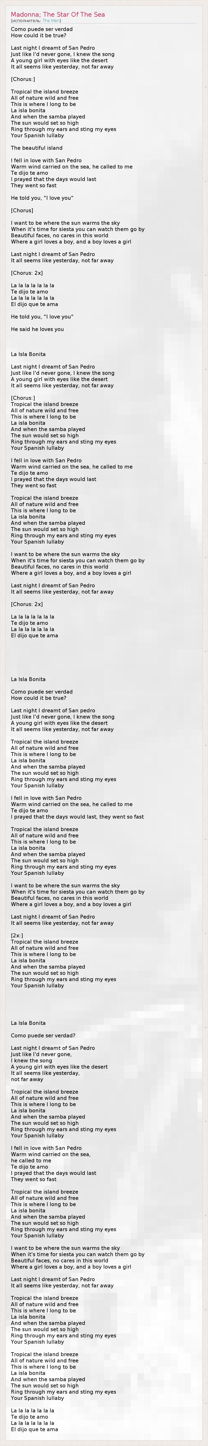 Como puede ser verdad How could it be true? Last night I dreamt of San Pedro Just like I'd never gone, I knew the song A young girl with eyes like the desert It all seems like yesterday, not far away [Chorus:] Tropical the island breeze All of nature wild and free This is where I long to be La isla bonita And when the samba played The sun would set so high Ring through my ears and sting my eyes Your Spanish lullaby The beautiful island I fell in love with San Pedro Warm wind carried on the sea, he called to me Te dijo te amo I prayed that the days would last They went so fast He told you, "I love you" [Chorus] I want to be where the sun warms the sky When it's time for siesta you can watch them go by Beautiful faces, no cares in this world Where a girl loves a boy, and a boy loves a girl Last night I dreamt of San Pedro It all seems like yesterday, not far away [Chorus: 2x] La la la la la la la Te dijo te amo La la la la la la la El dijo que te ama He told you, "I love you" He said he loves you La Isla Bonita Last night I dreamt of San Pedro Just like I'd never gone, I knew the song A young girl with eyes like the desert It all seems like yesterday, not far away [Chorus:] Tropical the island breeze All of nature wild and free This is where I long to be La isla bonita And when the samba played The sun would set so high Ring through my ears and sting my eyes Your Spanish lullaby I fell in love with San Pedro Warm wind carried on the sea, he called to me Te dijo te amo I prayed that the days would last They went so fast Tropical the island breeze All of nature wild and free This is where I long to be La isla bonita And when the samba played The sun would set so high Ring through my ears and sting my eyes Your Spanish lullaby I want to be where the sun warms the sky When it's time for siesta you can watch them go by Beautiful faces, no cares in this world Where a girl loves a boy, and a boy loves a girl Last night I dreamt of San Pedro It all seems like yesterday, not far away [Chorus: 2x] La la la la la la la Te dijo te amo La la la la la la la El dijo que te ama La Isla Bonita Como puede ser verdad How could it be true? Last night I dreamt of San pedro Just like I'd never gone, I knew the song A young girl with eyes like the desert It all seems like yesterday, not far away Tropical the island breeze All of nature wild and free This is where I long to be La isla bonita And when the samba played The sun would set so high Ring through my ears and sting my eyes Your Spanish lullaby I fell in love with San Pedro Warm wind carried on the sea, he called to me Te dijo te amo I prayed that the days would last, they went so fast Tropical the island breeze All of nature wild and free This is where I long to be La isla bonita And when the samba played The sun would set so high Ring through my ears and sting my eyes Your Spanish lullaby I want to be where the sun warms the sky When it's time for siesta you can watch them go by Beautiful faces, no cares in this world Where a girl loves a boy, and a boy loves a girl Last night I dreamt of San Pedro It all seems like yesterday, not far away [2x:] Tropical the island breeze All of nature wild and free This is where I long to be La isla bonita And when the samba played The sun would set so high Ring through my ears and sting my eyes Your Spanish lullaby La Isla Bonita Como puede ser verdad? Last night I dreamt of San Pedro Just like I'd never gone, I knew the song A young girl with eyes like the desert It all seems like yesterday, not far away Tropical the island breeze All of nature wild and free This is where I long to be La isla bonita And when the samba played The sun would set so high Ring through my ears and sting my eyes Your Spanish lullaby I fell in love with San Pedro Warm wind carried on the sea, he called to me Te dijo te amo I prayed that the days would last They went so fast Tropical the island breeze All of nature wild and free This is where I long to be La isla bonita And when the samba played The sun would set so high Ring through my ears and sting my eyes Your Spanish lullaby I want to be where the sun warms the sky When it's time for siesta you can watch them go by Beautiful faces, no cares in this world Where a girl loves a boy, and a boy loves a girl Last night I dreamt of San Pedro It all seems like yesterday, not far away Tropical the island breeze All of nature wild and free This is where I long to be La isla bonita And when the samba played The sun would set so high Ring through my ears and sting my eyes Your Spanish lullaby Tropical the island breeze All of nature wild and free This is where I long to be La isla bonita And when the samba played The sun would set so high Ring through my ears and sting my eyes Your Spanish lullaby La la la la la la la Te dijo te amo La la la la la la la El dijo que te ama