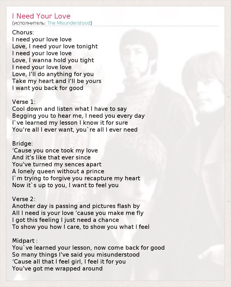 Chorus: I need your love love Love, I need your love tonight I need your love love Love, I wanna hold you tight I need your love love Love, I'll do anything for you Take my heart and I'll be yours I want you back for good Verse 1: Cool down and listen what I have to say Begging you to hear me, I need you every day I`ve learned my lesson I know it for sure You're all I ever want, you`re all I ever need Bridge: ‘Cause you once took my love And it's like that ever since You've turned my sences apart A lonely queen without a prince I`m trying to forgive you recapture my heart Now it`s up to you, I want to feel you Verse 2: Another day is passing and pictures flash by All I need is your love ‘cause you make me fly I got this feeling I just need a chance To show you how I care, to show you what I feel Midpart : You`ve learned your lesson, now come back for good So many things I've said you misunderstood ‘Cause all that I feel girl, I feel it for you You've got me wrapped around