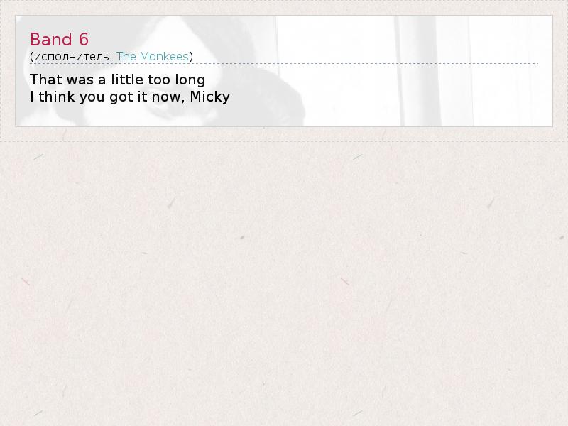 Это интересно:The Monkees — американский поп-рок-квартет, который записывался и выступал с концертами с 1966 по 1971 годы. Участники группы были впервые собраны вместе в 1965 году телеканалом NBC для съемок в телесериале о буднях современной рок-группы, образцом для которого послужил фильм The Beatles «Вечер трудного дня».Успех сериала превзошёл все ожидания, и участники The Monkees (их название означает «мартышки»... продолжение