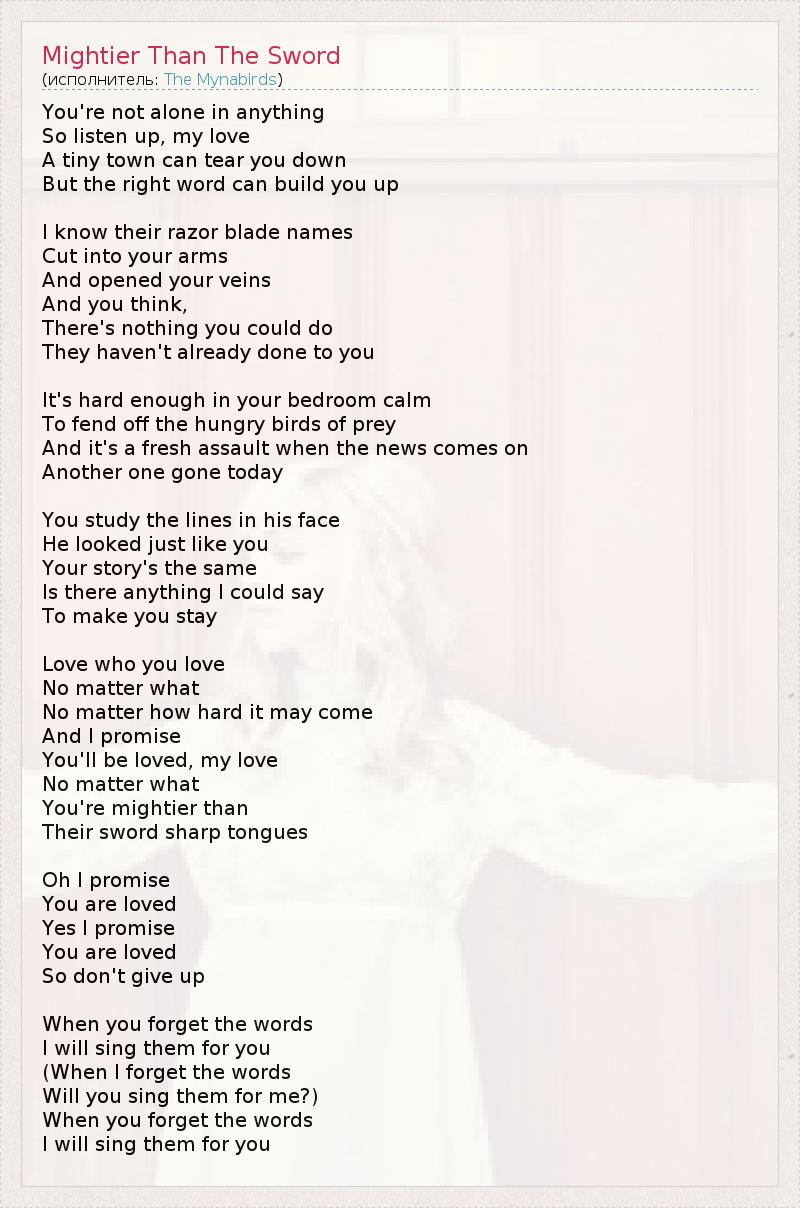You're not alone in anything So listen up, my love A tiny town can tear you down But the right word can build you up I know their razor blade names Cut into your arms And opened your veins And you think, There's nothing you could do They haven't already done to you It's hard enough in your bedroom calm To fend off the hungry birds of prey And it's a fresh assault when the news comes on Another one gone today You study the lines in his face He looked just like you Your story's the same Is there anything I could say To make you stay Love who you love No matter what No matter how hard it may come And I promise You'll be loved, my love No matter what You're mightier than Their sword sharp tongues Oh I promise You are loved Yes I promise You are loved So don't give up When you forget the words I will sing them for you (When I forget the words Will you sing them for me?) When you forget the words I will sing them for you